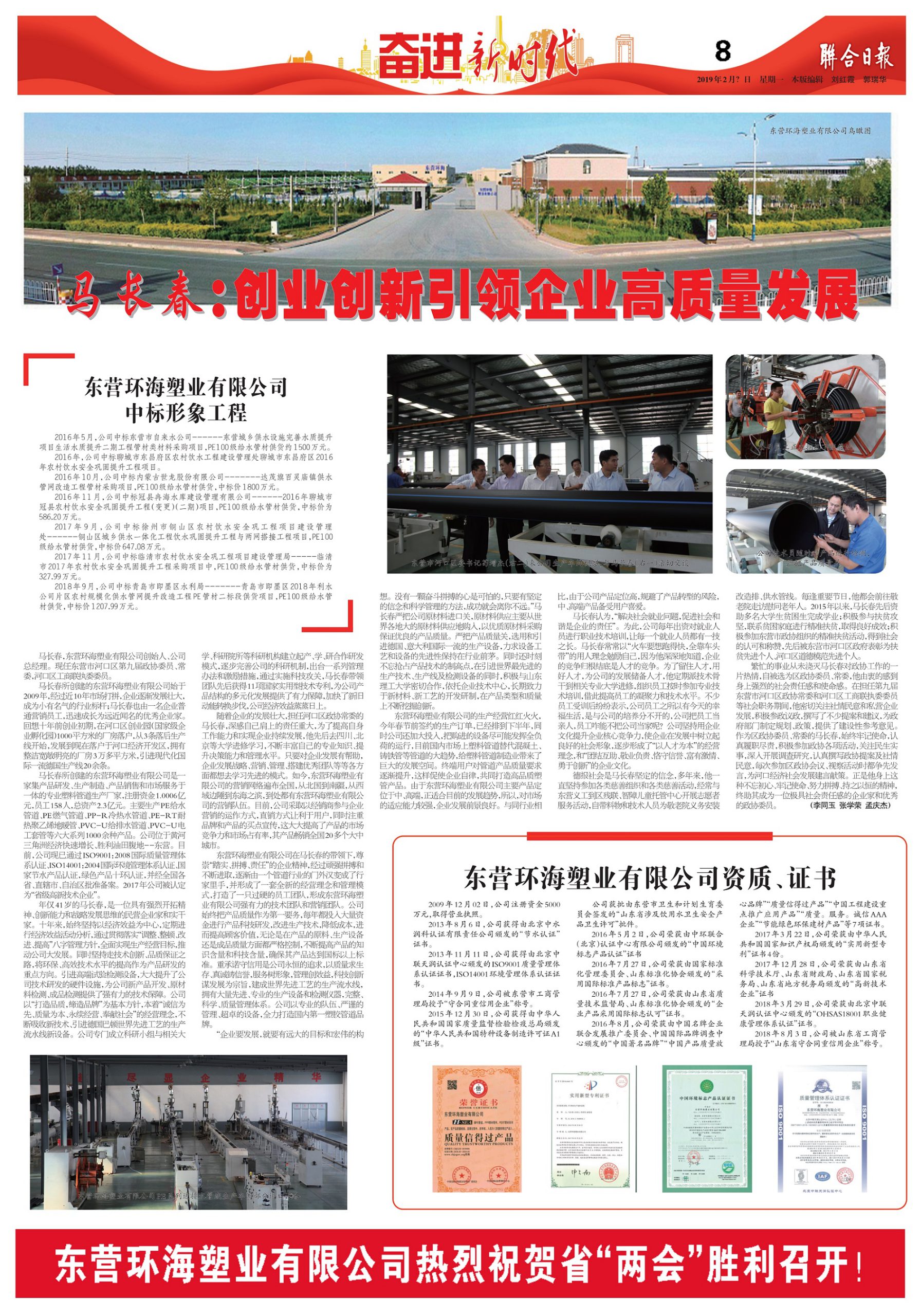 山東環(huán)海塑業(yè)有限公司始建于2009年,注冊(cè)資金10008萬(wàn)元,是一家國(guó)有控股企業(yè),由市屬?lài)?guó)有企業(yè)德州市國(guó)融資產(chǎn)運(yùn)營(yíng)有限公司控股。公司占地188畝,建筑面積3萬(wàn)平方米,坐落于黃河三角洲勝利油田腹地一東營(yíng),位于環(huán)渤海經(jīng)濟(jì)區(qū)與黃河經(jīng)濟(jì)帶的交匯點(diǎn),毗鄰東營(yíng)港與榮烏高速,區(qū)位優(yōu)勢(shì)顯著而且交通便利。公司擁有意大利進(jìn)口百旺(PIOVAN)全套除濕干燥上料設(shè)備以及德國(guó)進(jìn)口巴頓菲爾辛辛那提、克勞斯瑪菲全電腦控制生產(chǎn)線(xiàn)20余條,引進(jìn)世界先進(jìn)的德國(guó)技術(shù),采用國(guó)內(nèi)中石油、中石化等央企國(guó)標(biāo)以及國(guó)際進(jìn)口原材料,憑借專(zhuān)業(yè)的隊(duì)伍、嚴(yán)謹(jǐn)?shù)墓芾?、精密的設(shè)備,著力打造“環(huán)海品牌”給排水管道系列品牌。目前公司主要生產(chǎn)PE 供水管道、PE燃?xì)夤艿?、PE-RT地暖管道、PE-RTⅡ型熱力管道四大系列產(chǎn)品,產(chǎn)品廣泛應(yīng)用于給水、排污、燃?xì)?、采暖等領(lǐng)域,是一家集產(chǎn)品研發(fā)、制造、銷(xiāo)售、市場(chǎng)服務(wù)于一體的現(xiàn)代化高新技術(shù)企業(yè)。